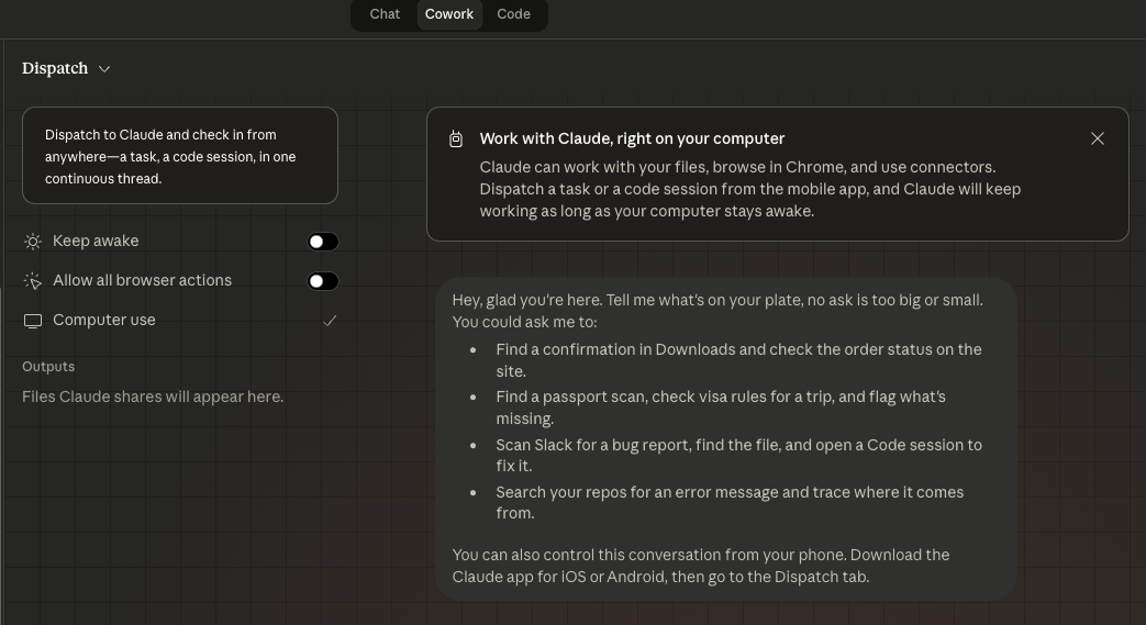 Dispatch creates a single persistent conversation between your phone and desktop. Message Claude from the train, and it works on your desktop while you commute. Come back to finished work.